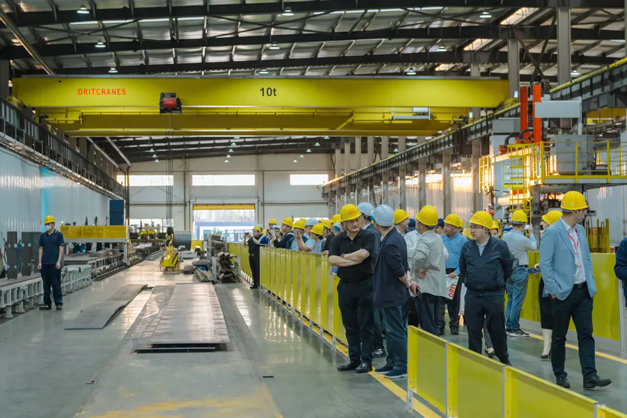 10月18日下午,所有參會(huì)代表一并參觀奧力通揚(yáng)州智能工廠。奧力通揚(yáng)州智能工廠學(xué)習(xí)了歐洲先進(jìn)制造經(jīng)驗(yàn),在此基礎(chǔ)之上,研制了歐式起重機(jī)主梁專(zhuān)用工藝、腹板整切工藝、整梁拋丸消應(yīng)力工藝、預(yù)組裝工藝,以及主梁智能制造生產(chǎn)線(xiàn),比如加強(qiáng)筋自動(dòng)組焊線(xiàn)、隔板機(jī)器人、主梁組立機(jī)器人、智能平臺(tái)等,使整體生產(chǎn)效率提升約300%,節(jié)省人工近60%。