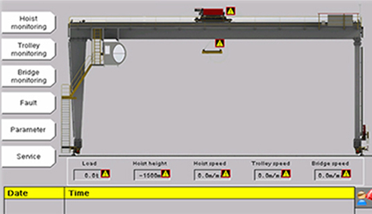 遠程監控: 通過物聯網遠程管理、實時掌握智能起重機運行狀態,實時顯示各個機構運行參數、損耗、剩余壽命。無論身處何方,通過授權的遠程診斷系統,均能實現遠程故障診斷和預防性維保,確保智能起重機處于良好狀態。